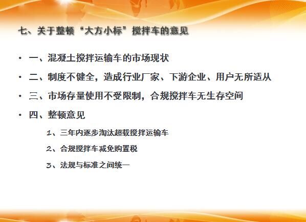 隨后,會(huì)長分析了攪拌車的市場現(xiàn)狀,制度不健全,造成行業(yè)廠家、下游企業(yè)、用戶無所適從,市場存量使用不受限制,合規(guī)攪拌車無生存空間;同時(shí)提出了建設(shè)性的整頓意見。