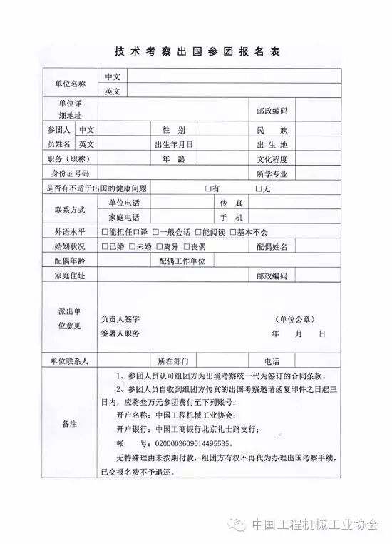 考察團初步預(yù)計境外活動時間14天,參團費3萬元人民幣/人,其中含往返機票、境外食宿費、境外交通費、雜費等,不包括在國內(nèi)發(fā)生的費用。歡迎工程機械相關(guān)單位人員報名參加,報名費2000元,用于辦理出國手續(xù)。