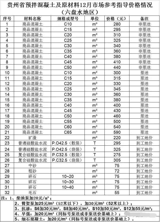 貴州省預(yù)拌混凝土及原材料12月市場(chǎng)參考指導(dǎo)價(jià)格情況
