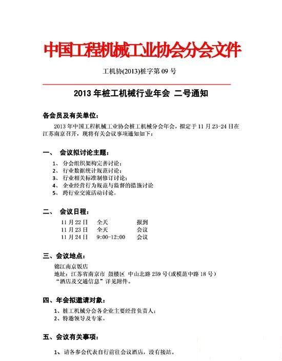 2013年中國工程機(jī)械工業(yè)協(xié)會樁工機(jī)械分會年會,將于11月23—24在江蘇南京錦江南京飯店召開。會議將邀請樁工機(jī)械分會各企業(yè)主要經(jīng)營負(fù)責(zé)人以及專家學(xué)者參會。會議將組織分會組織架構(gòu)完善討論、行業(yè)數(shù)據(jù)統(tǒng)計(jì)規(guī)范討論、行業(yè)相關(guān)標(biāo)準(zhǔn)制修訂討論、企業(yè)經(jīng)營行為規(guī)范與監(jiān)督的措施討論、跨行業(yè)交流活動討論。
