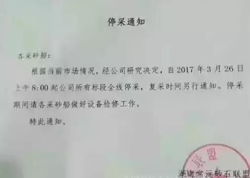 湖南常沅砂石聯(lián)盟近日發(fā)布停采通知,自2017年3月26日上午8:00起,該公司所有標(biāo)段全線停采砂石,復(fù)采時間待定。這停采了,砂石供應(yīng)可咋辦呢?