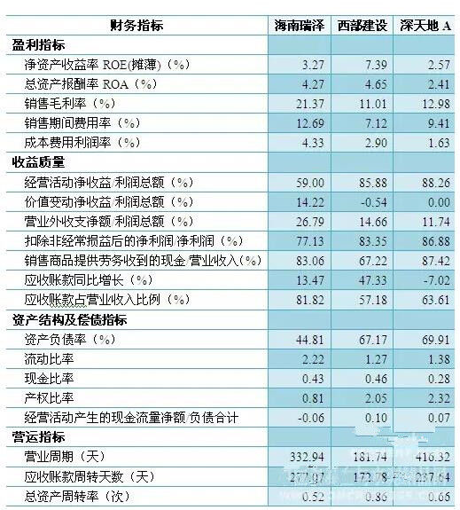 西部建設(shè)、深天地的資產(chǎn)負(fù)債率復(fù)合行業(yè)平均水平,海南瑞澤負(fù)債率較低,償債風(fēng)險偏低,同時其他償債指標(biāo)也顯示海南瑞澤具有較低的債務(wù)風(fēng)險,但由于經(jīng)營活動產(chǎn)生的現(xiàn)金凈流量為負(fù)值,因此主營業(yè)務(wù)正常經(jīng)營的償債能力較弱,有待提升業(yè)務(wù)正常經(jīng)營的穩(wěn)定性和盈利能力。