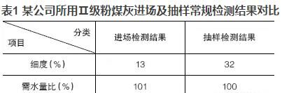 優(yōu)質(zhì)的粉煤灰摻入混凝土可明顯地改善混凝土的和易性,當(dāng)粉煤灰摻量大于膠材總量的5%~10%時(shí),效果極為明顯?,F(xiàn)今在混凝土實(shí)際生產(chǎn)中,粉煤灰摻量往往達(dá)到20%,有的甚至高達(dá)30%,但混凝土的和易性卻不盡人意。抽取原材料進(jìn)行檢測(cè)時(shí),發(fā)現(xiàn)粉煤灰的檢測(cè)結(jié)果經(jīng)常不滿足標(biāo)準(zhǔn)要求或者與驗(yàn)收時(shí)的結(jié)果相差甚遠(yuǎn)。現(xiàn)以某公司所用Ⅱ級(jí)粉煤灰進(jìn)場(chǎng)及抽樣常規(guī)檢測(cè)結(jié)果進(jìn)行對(duì)比,見(jiàn)表1。