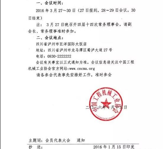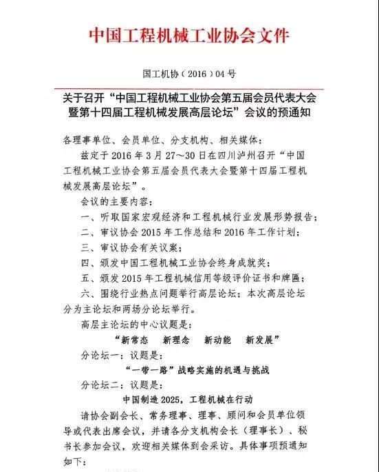 茲定于2016年3月27日~30日在四川瀘州召開“中國(guó)工程機(jī)械工業(yè)協(xié)會(huì)第五屆會(huì)員代表大會(huì)暨第十四屆工程機(jī)械發(fā)展高層論壇”。