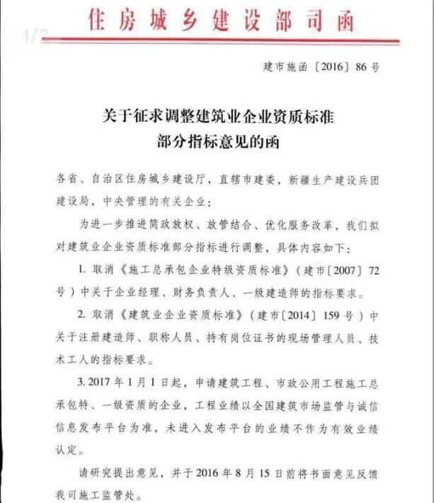 近日,住房和城鄉(xiāng)建設(shè)部建筑市場監(jiān)管司就“調(diào)整建筑業(yè)企業(yè)資質(zhì)標(biāo)準(zhǔn)部分指標(biāo)”征求意見(建市施函[2016]86號),主要內(nèi)容有以下兩點: