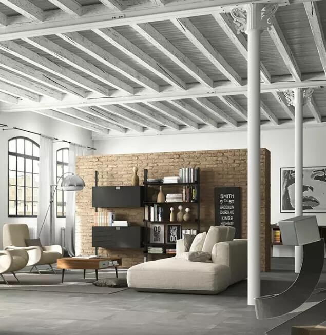 水泥灰的瓷磚,白色吊頂及墻面,營造出一種略微冰涼不近人情的工業(yè)氛圍,空闊粗糙的設(shè)計(jì)感,組成一個(gè)有著極大吸引力的家居風(fēng)格。