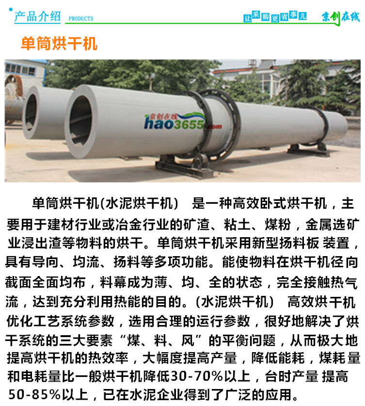 單筒烘干機(jī)φ3×25,也叫滾筒干燥機(jī),它廣泛用于建材、冶金、化工、水泥工業(yè)烘干礦渣石灰石、煤粉、礦渣、粘土等物料。該機(jī)主要由回轉(zhuǎn)體、揚(yáng)料板,傳動裝置,支撐裝置及密封圈等部件組成。具有結(jié)構(gòu)合理,制作精良,產(chǎn)量高,能耗低,運(yùn)轉(zhuǎn)方便等優(yōu)點。
