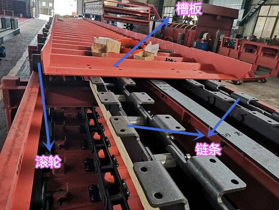 板式給料機(jī)運(yùn)行部件由牽引鏈條,承載構(gòu)件行走滾輪和輸送槽板等組成。