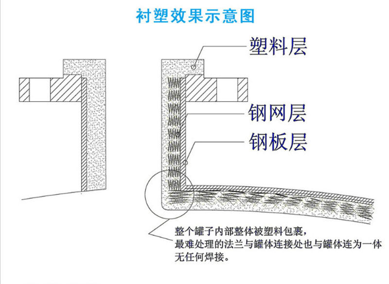 鋼襯塑產品一般由桶身、平底、封頂、人孔、進料口法蘭、出料口法蘭和液位孔口法蘭組成,臥室鋼襯塑儲罐通常還有標準鋼質支座,鋼襯塑產品一般根據(jù)用戶要求設計制造。