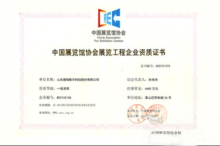 2015年5月28日,山東捷瑞數(shù)字科技股份有限公司順利通過(guò)中國(guó)展覽館協(xié)會(huì)的審核,正式被認(rèn)定為中國(guó)展覽展示行業(yè)最高資質(zhì):展覽工程企業(yè)一級(jí)資質(zhì),并獲得中國(guó)展覽館協(xié)會(huì)頒發(fā)的資質(zhì)證書(shū)。